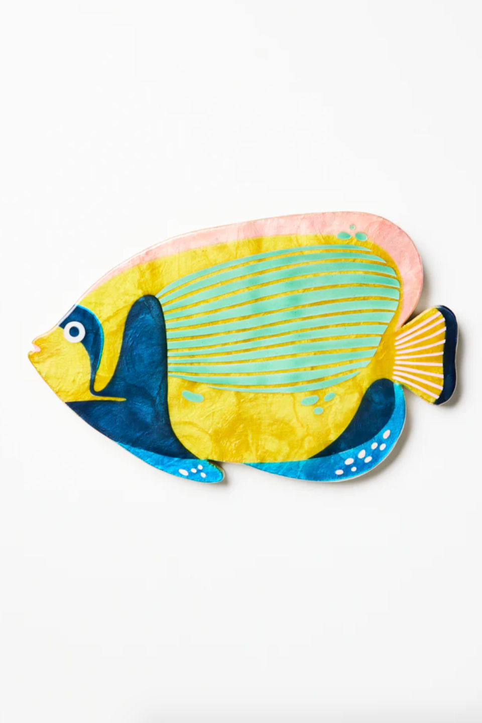 Vibrant yellow fins and precise blue details transform this angel fish into a statement wall piece that commands attention. Hand-crafted from Capiz shell harvested sustainably from Philippine waters each piece is meticulously cut, placed and then painted by skilled artisans. This Sydney-designed artwork brings sophisticated coastal character to your home, its generous scale and luminous quality creating a focal point that transforms ordinary walls into underwater galleries.
