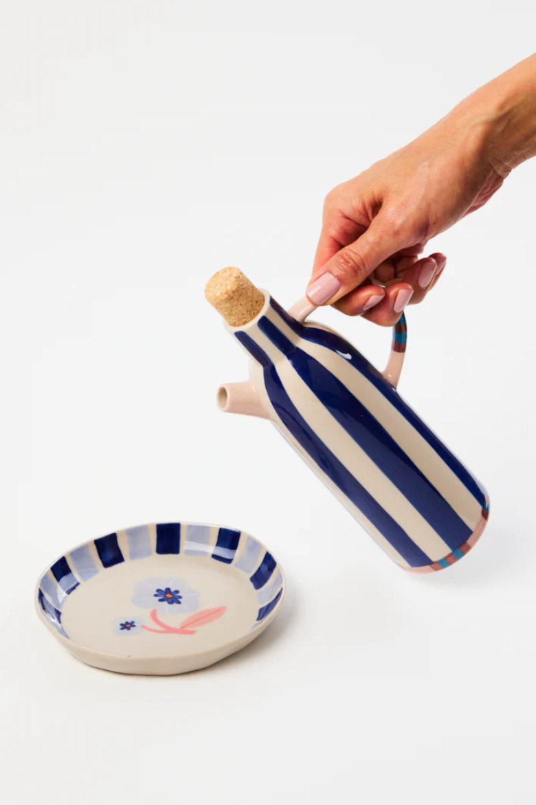 This striped oil pourer is made for olive oil, vinaigrettes or dressing your table with something a little special. Handcrafted from earthenware and finished with a snug cork stopper. Sitting next to the stove, it's a chic addition to the kitchen which is highly functional.