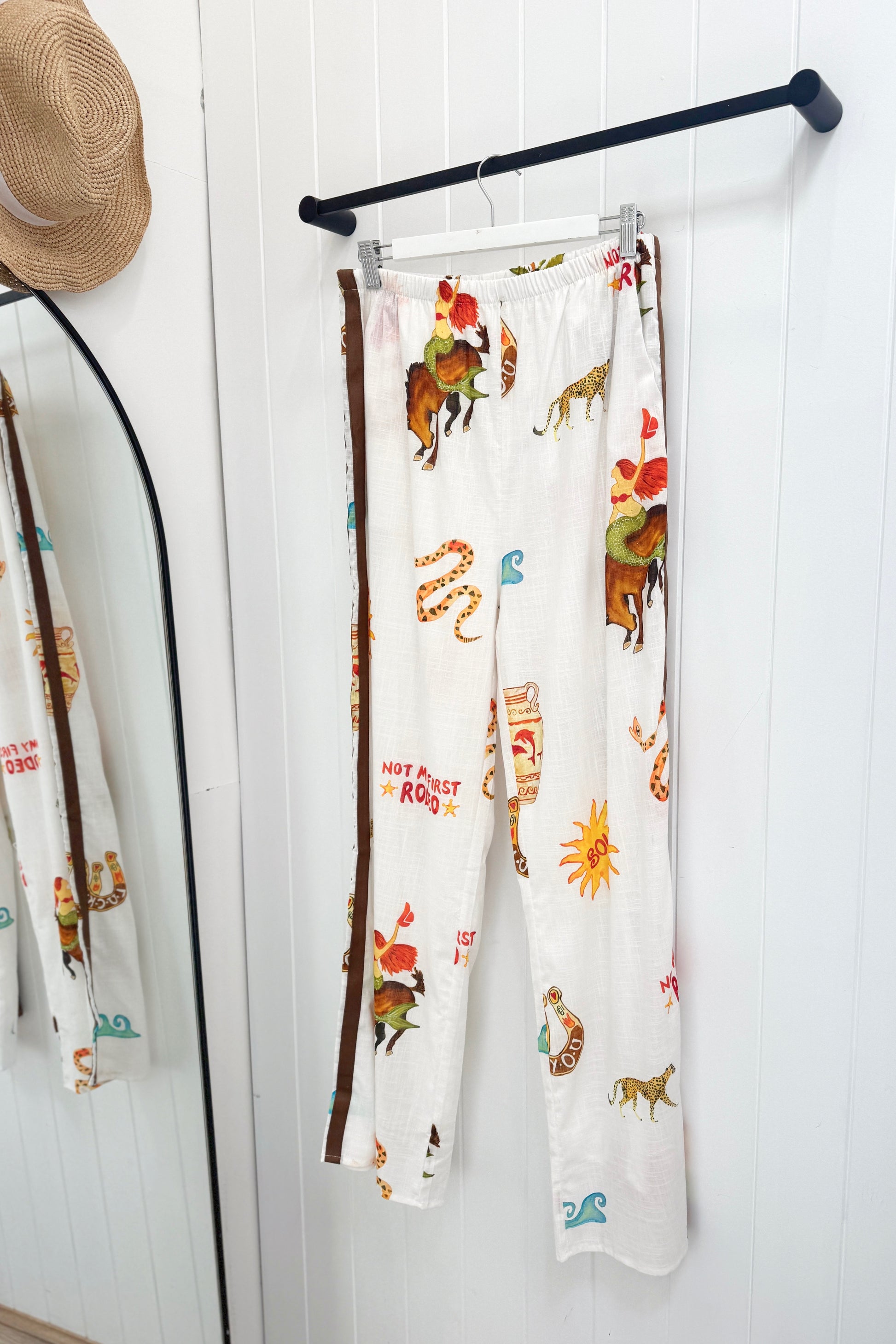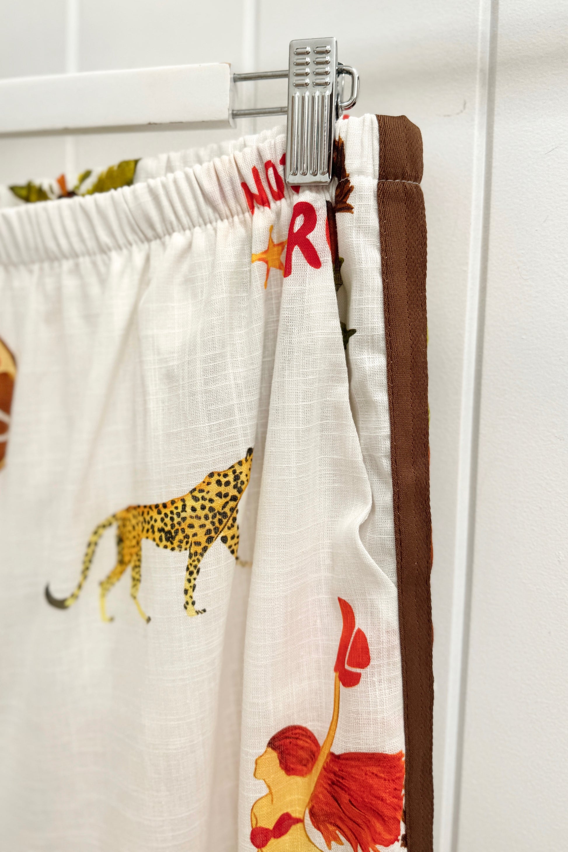Bring a fun summer sporty vibe to your wardrobe with these eye-catching printed pants. The vibrant colours combined with the side stripes gives these pants a sporty yet trendy vibe. Made from lightweight, breathable cotton, they offer the perfect balance of comfort and style. The wide-legged design ensures a relaxed fit, making them ideal for both lounging and casual outings. Pair them with a simple top or graphic tee for an effortlessly chic look that's sure to turn heads.