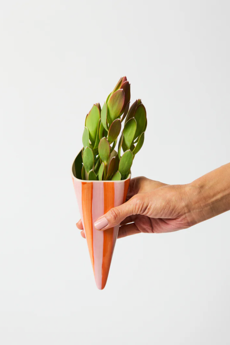 A classic with a twist. The Folly Red Stripe Wall Vase is hand-painted with bold crimson and white vertical stripes, with a contrast of sky blue inside for a cheeky surprise. With its tapered cone shape and glossy finish, it brings graphic charm to small spaces. Hang it solo, or as part of a cluster.