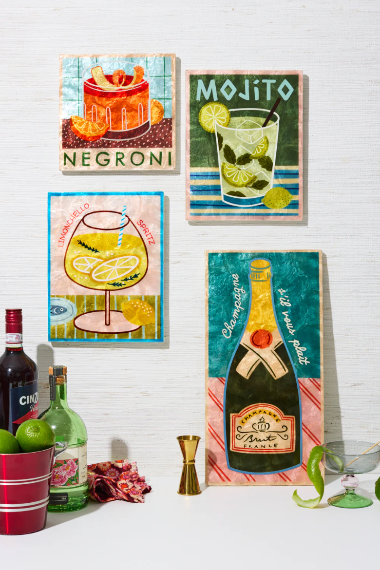 Fresh, fizzy and full of minty goodness. Our Mojito cocktail tile is a nod to your favourite summer sip, complete with lime wheels, mint sprigs and striped retro vibes. Hand-painted on capiz shell with that signature mother of pearl shimmer of ours.