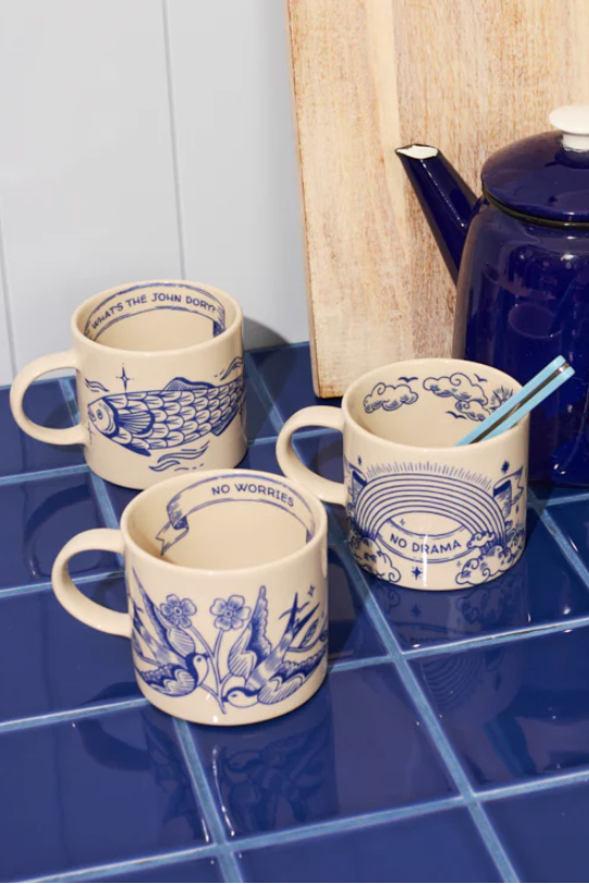 Keep things sunny with the Inked Mug. Hand-painted in timeless blue ink with floral and swallow motifs, this handmade mug captures the spirit of Australia's favourite saying. Durable enough for everyday use, it's a joyful gift that reminds you to go with the flow - no worries!