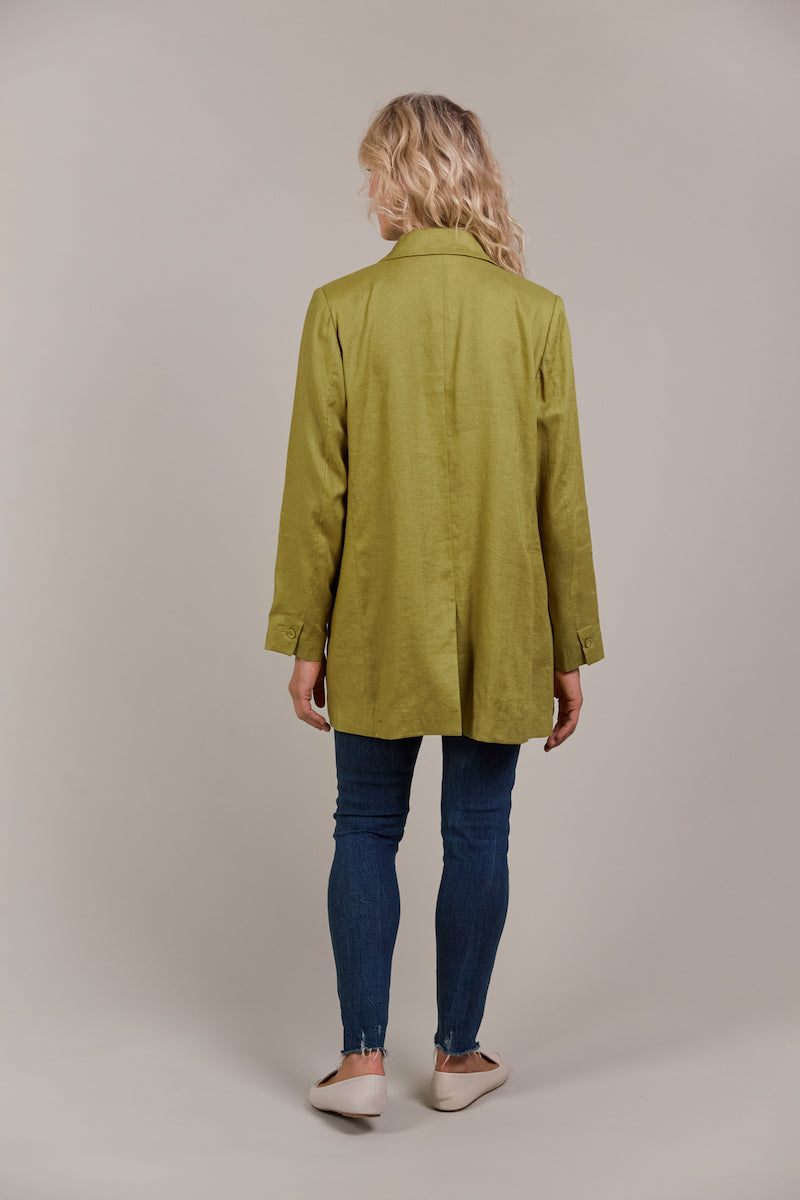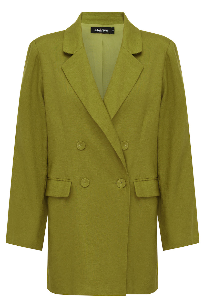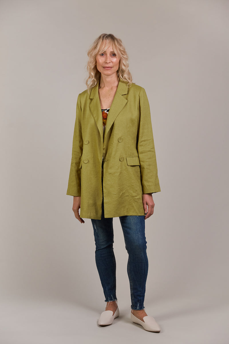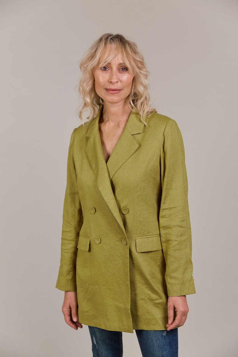 Add a touch of contemporary elegance to your wardrobe with the Laax Blazer, a fresh take on classic tailoring. With its sharp notched lapel, double-breasted design, and stylish 3/4 length, this blazer has flawless details that stand out. The structured shape brings sophistication to any look, making it suitable for the office, dining out, or special events. Made from a linen-cotton blend, it's an ideal piece for transeasonal dressing.