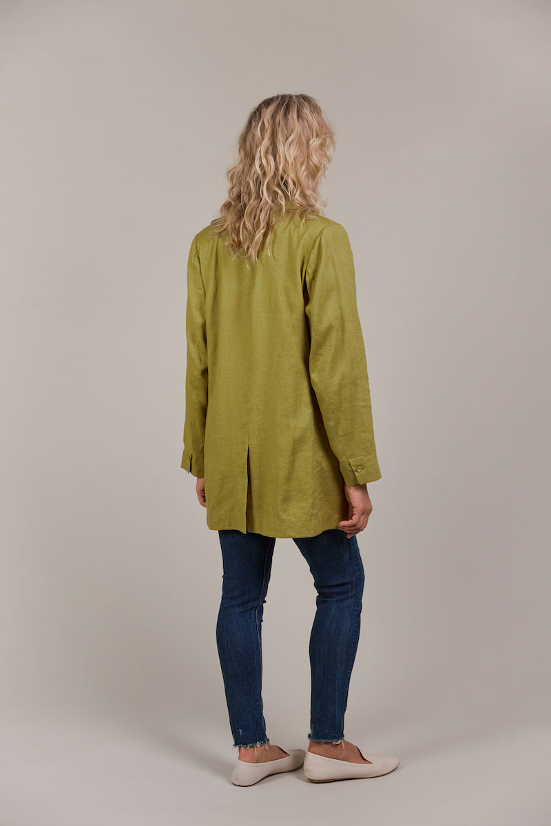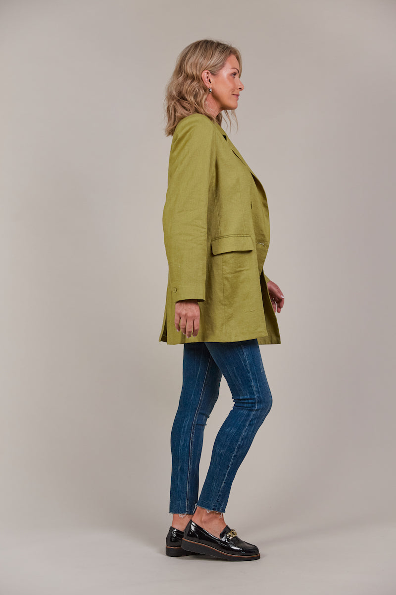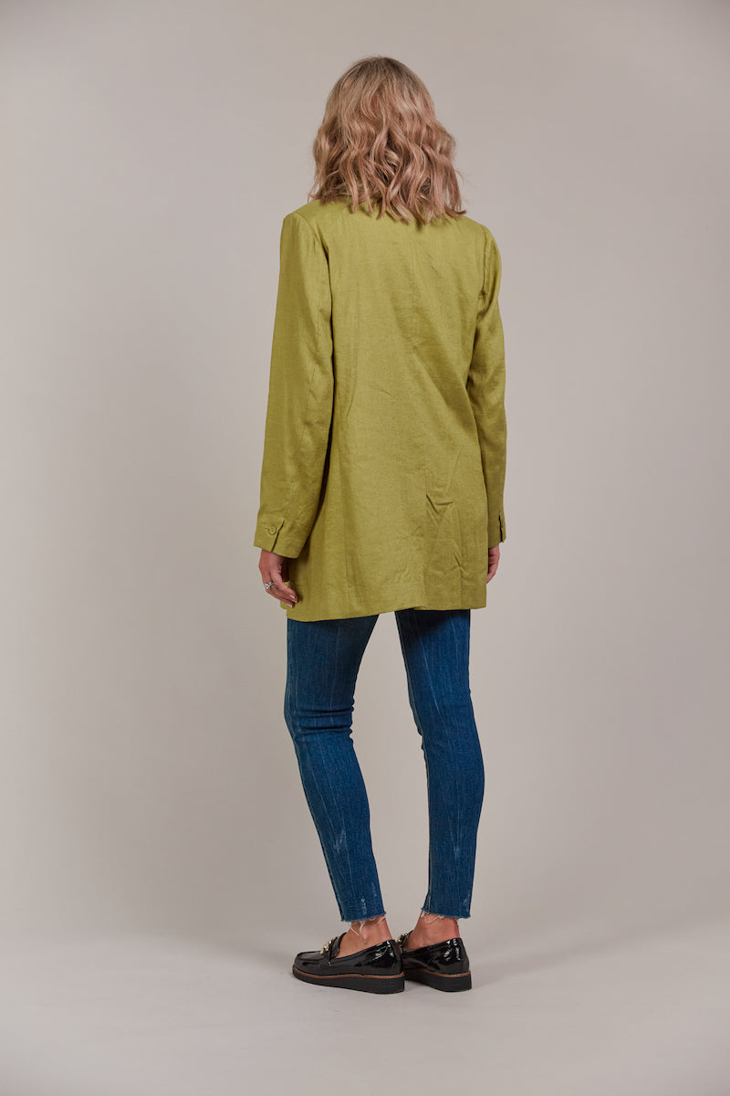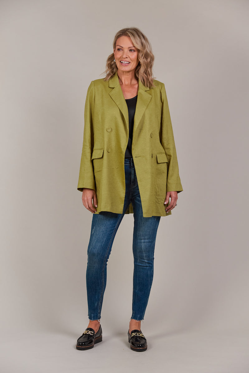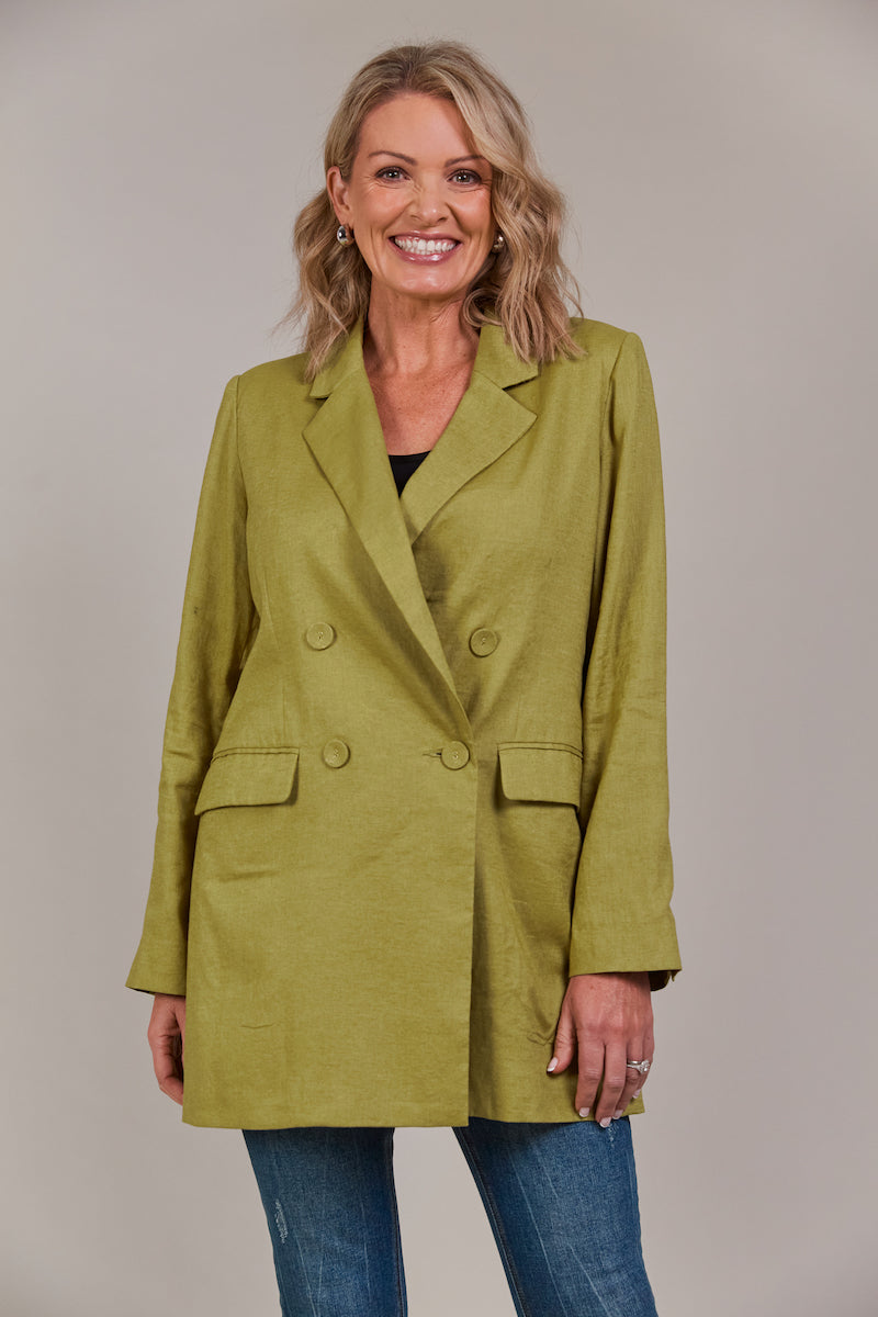 Add a touch of contemporary elegance to your wardrobe with the Laax Blazer, a fresh take on classic tailoring. With its sharp notched lapel, double-breasted design, and stylish 3/4 length, this blazer has flawless details that stand out. The structured shape brings sophistication to any look, making it suitable for the office, dining out, or special events. Made from a linen-cotton blend, it's an ideal piece for transeasonal dressing.