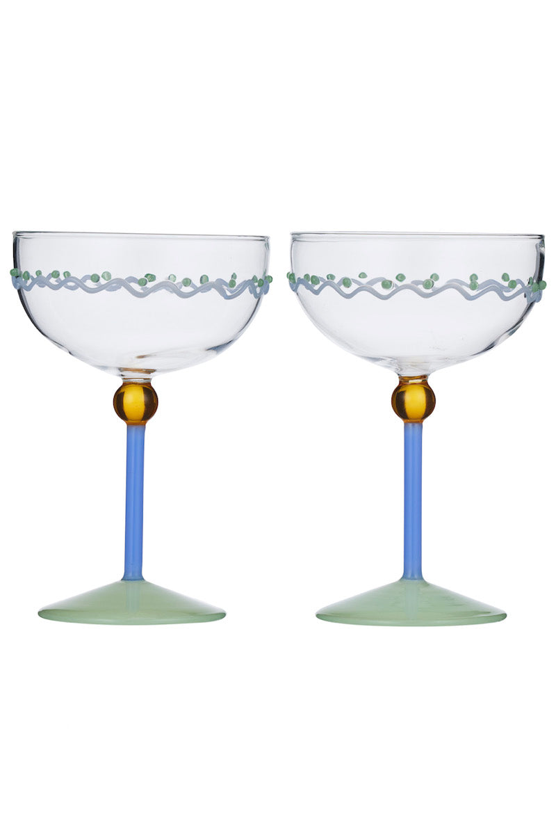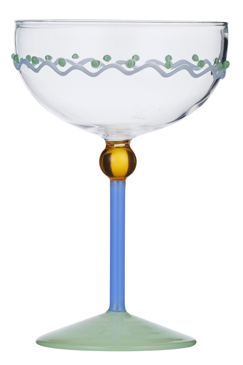 Playful yet refined, this set of two hand-blown cocktail coupes brings a burst of colour and personality to your glassware collection. Each glass features a pale green base, slender blue stem, and a golden orb detail — topped off with a delicate wavy pattern of blue and green dots around the rim.