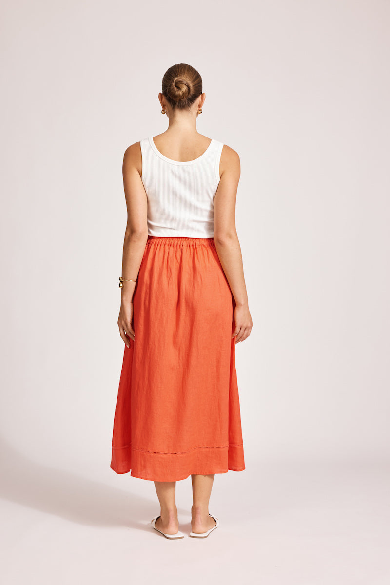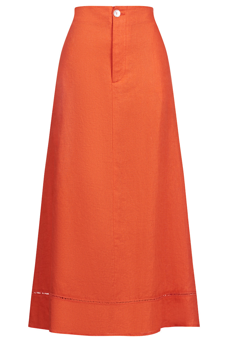 A timeless maxi skirt designed to flatter. Crafted from 100% linen with a flat front waistband and elasticated back for comfort. Features functional pockets, ladder lace trim above the hem, and an A-line silhouette.