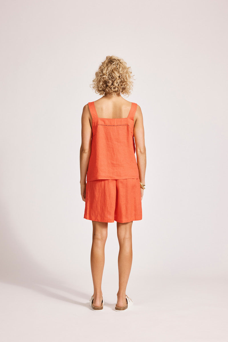 A timeless warm-weather essential. Crafted from 100% linen for breathable comfort. Features a square neckline, wide shoulder straps, and ladder lace trim detail. Designed in a structured, slightly cropped silhouette.