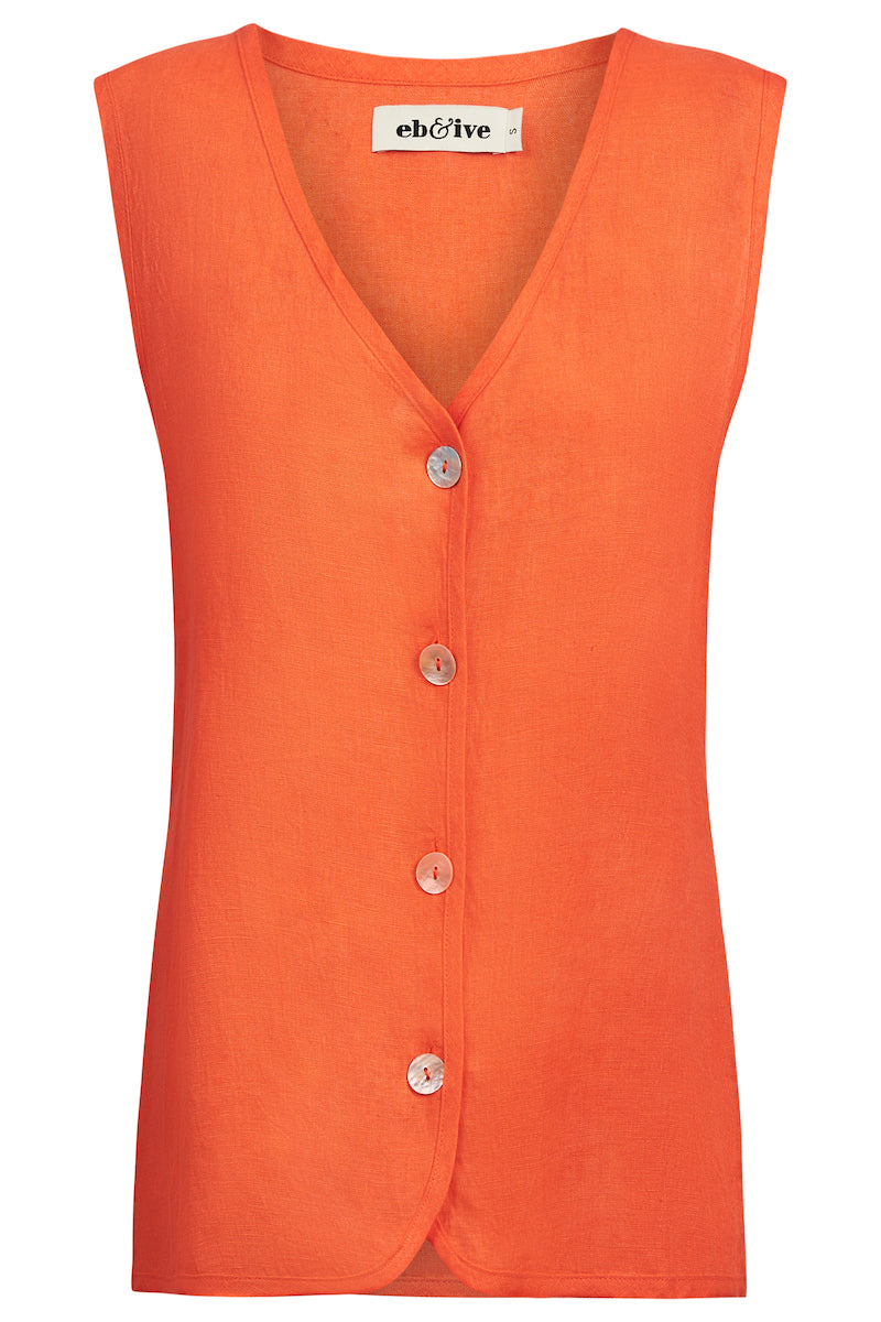 A relaxed essential with tailored flair. Crafted from 100% linen for breathable style. Features front button closures, curved hemline, and a D-ring puller at the back for a custom flattering fit at the waist.