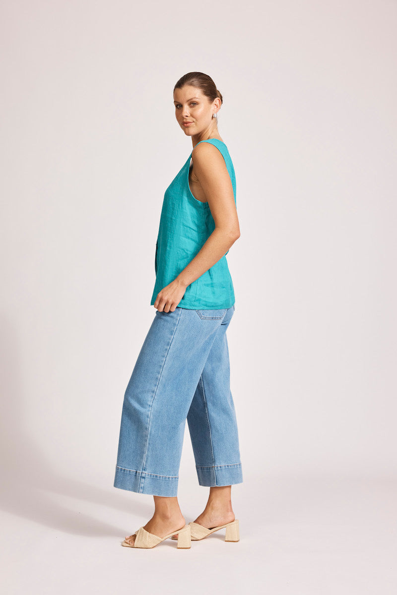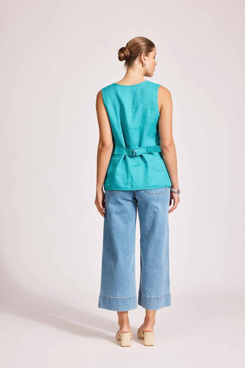 A relaxed essential with tailored flair. Crafted from 100% linen for breathable style. Features front button closures, curved hemline, and a D-ring puller at the back for a custom flattering fit at the waist.