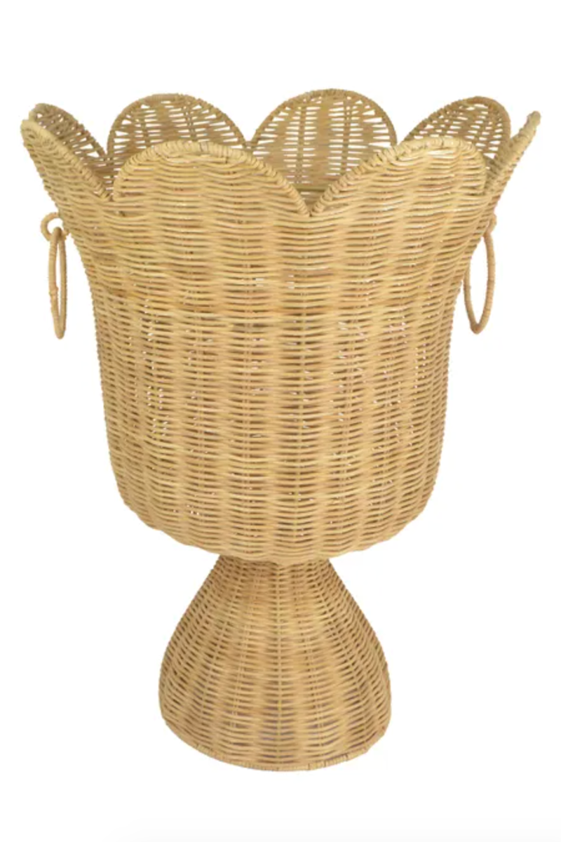 Introduce a touch of artisanal elegance to your home with this rattan urn. Crafted from natural wicker, this decorative urn features a unique pedestal base, scalloped rim, and elegant side handles for a sophisticated yet rustic appeal. Whether displayed as a standalone statement piece or filled with dried flowers, branches, or decorative accents, this wicker vase enhances any space with its warm, organic texture.