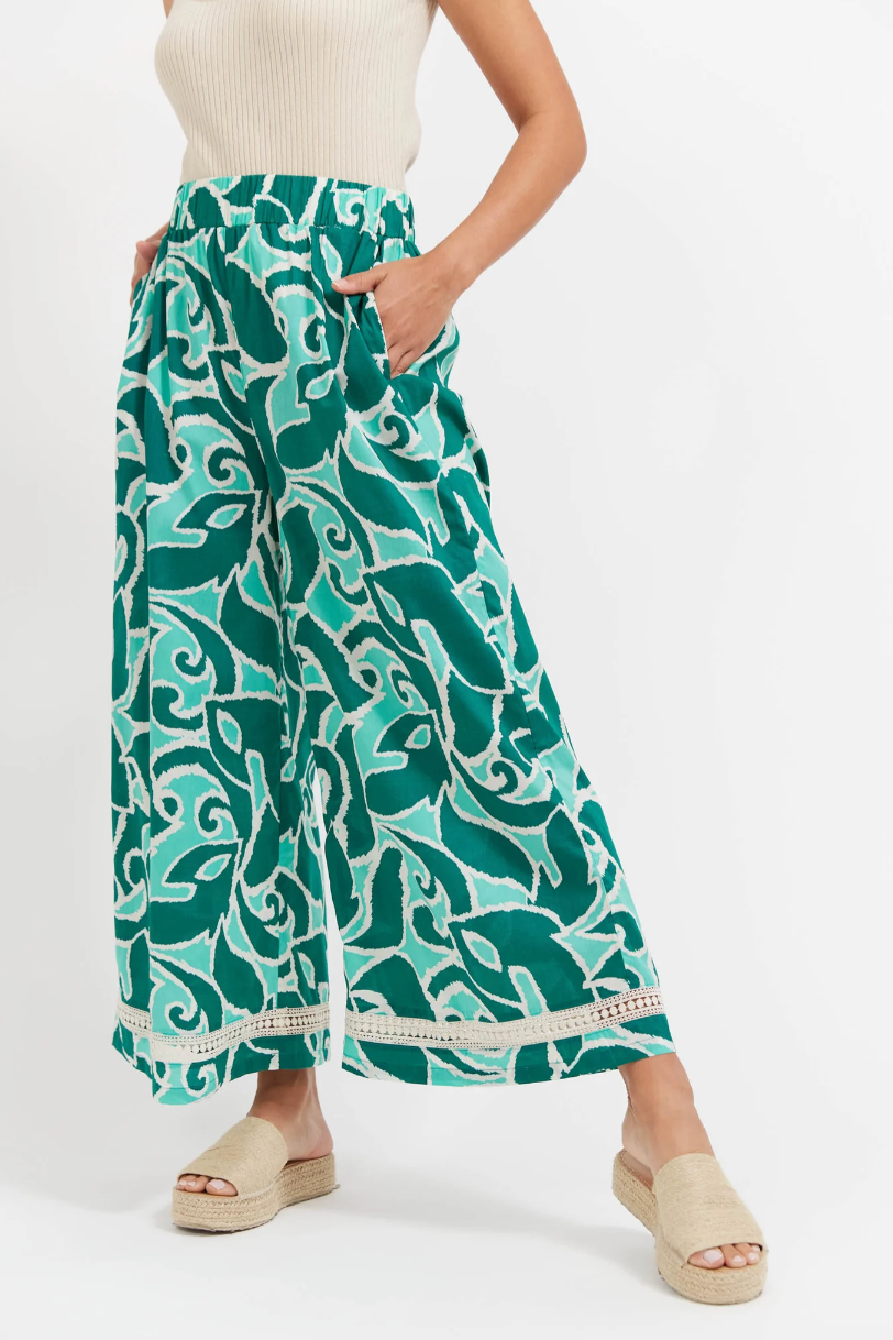 With a wide-leg silhouette, 7/8 length, and soft cotton feel, the Santos Pant strikes the perfect balance between casual comfort and refined. The wide elasticated waistband makes for an easy pull-on fit, while lace trim at the hem adds a feminine finish. Whether you're poolside or exploring a new city, pair it with a tucked-in tank or the matching Santos Shirt. Just add woven platform sandals and shimmering accessories.
