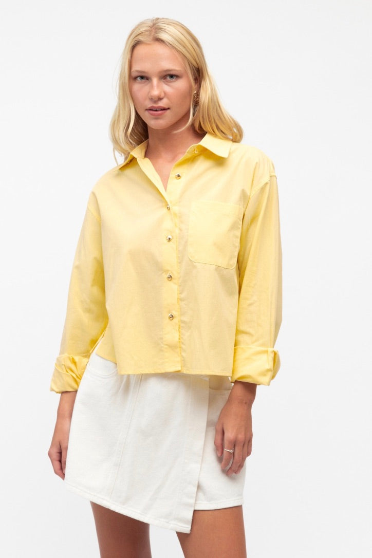 A super sweet and versatile button down shirt. With it's cropped length and gold shell button detail, this butter yellow shirt will take your from the beach to the bar and even to work.
