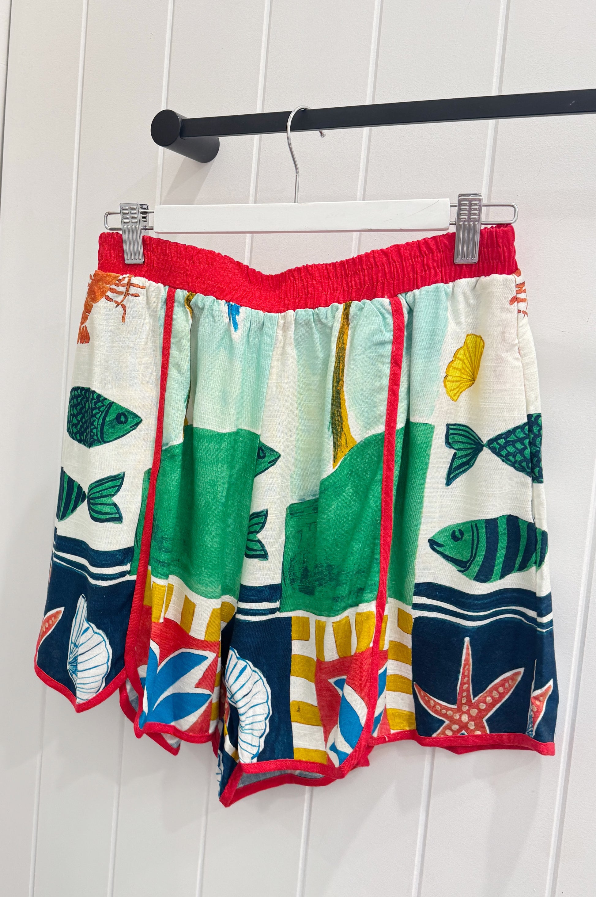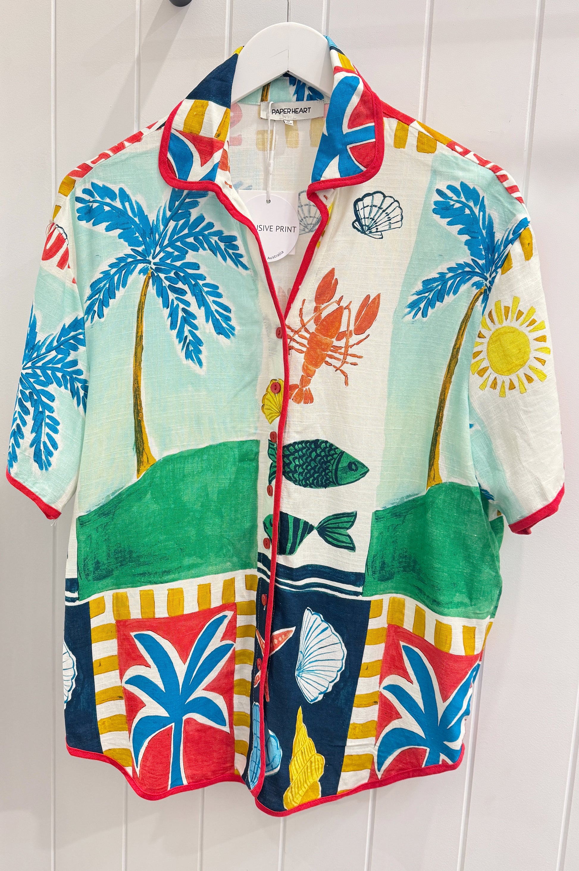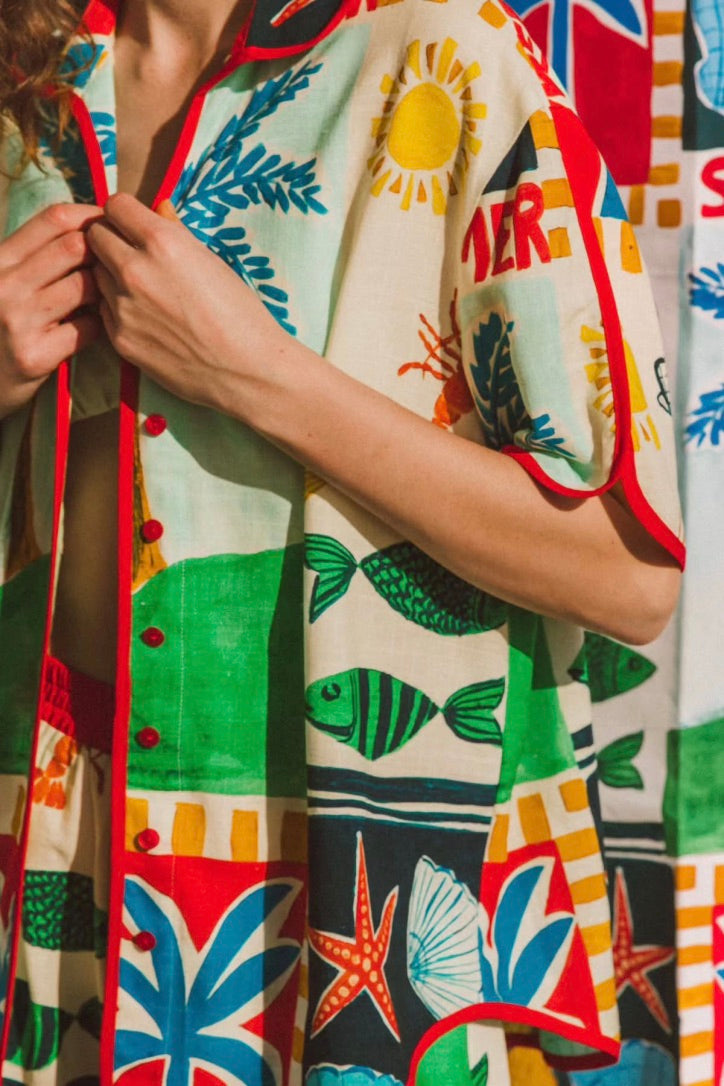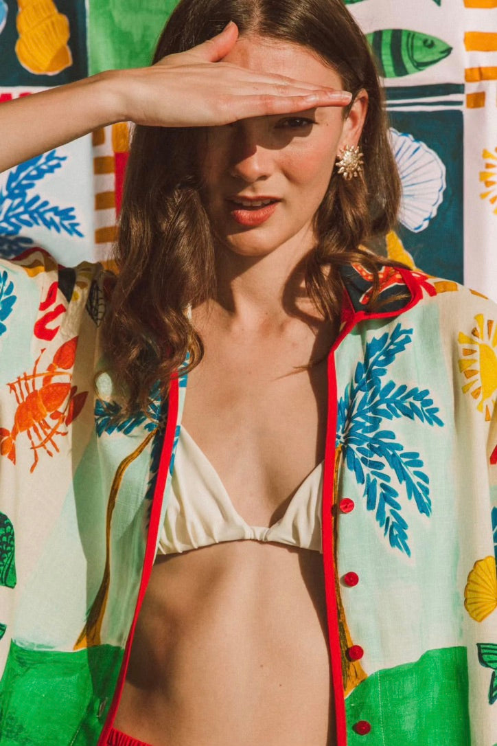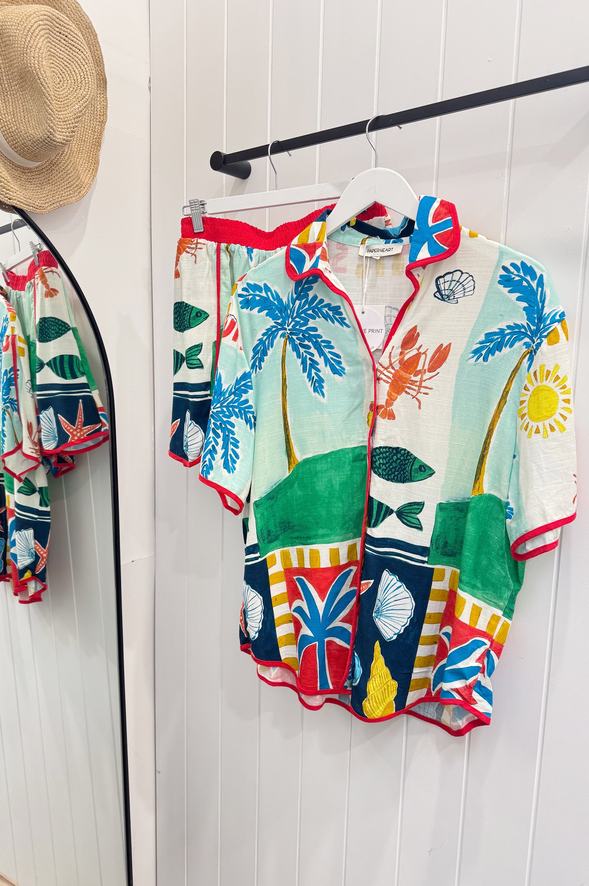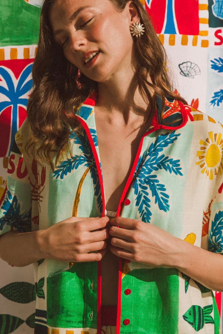 Bring the sunshine with our Soleil Summer collection — a vibrant trio splashed with painterly palms, seashells, and bold pops of red, green, and blue. Each piece feels like a postcard from paradise, made in breezy, lightweight fabric for long summer days and golden evenings.