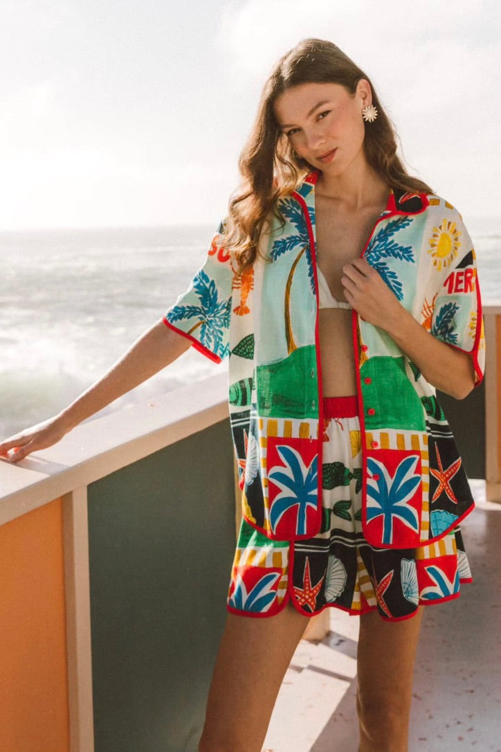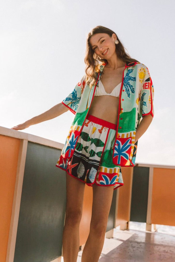 Relaxed yet playful, this matching set features an oversized button-up shirt and elastic-waist shorts. Trimmed with bold red accents, it’s the ultimate throw-on outfit for beach days, poolside lounging, or styling separately for a laidback holiday look.