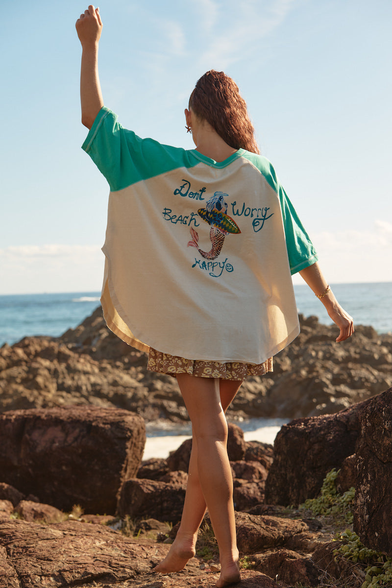 Designed with contrast raglan sleeves and a relaxed, easy fit, this tee features hand-drawn mermaid and shell artwork front and back, inspired by long beach days and carefree coastal living. Crafted from soft, breathable cotton, its perfect for throwing on over swim, styling back with denim or wearing on repeat from sunrise to sunset. A true wardrobe staple with major Seas The Day energy.