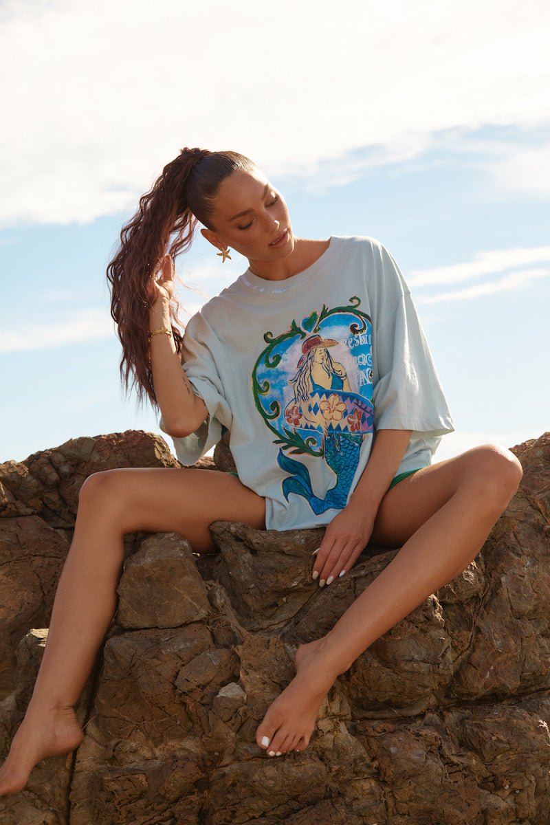 Designed in a very oversized, relaxed silhouette, this tee features a bold, hand-drawn mermaid graphic on the front and playful Wild & Free Just Like The Sea wording on the back.