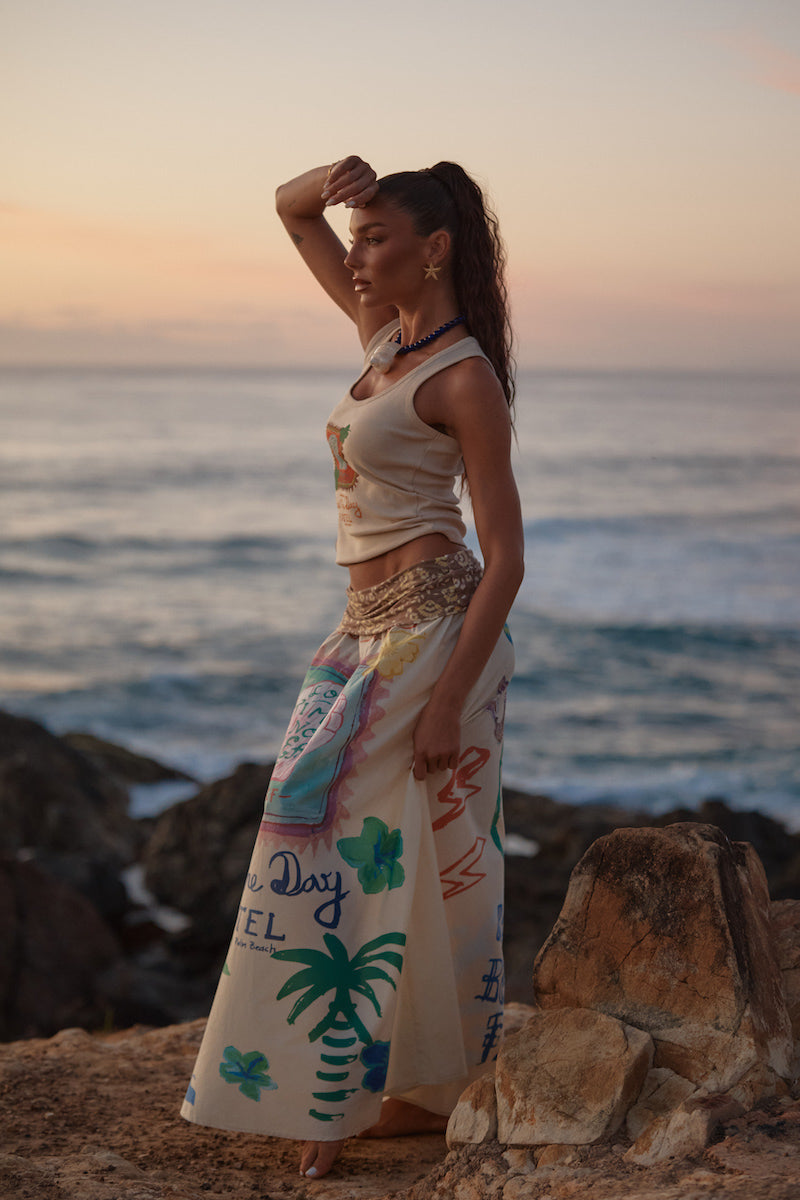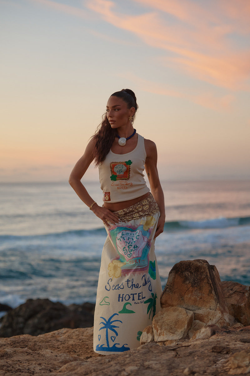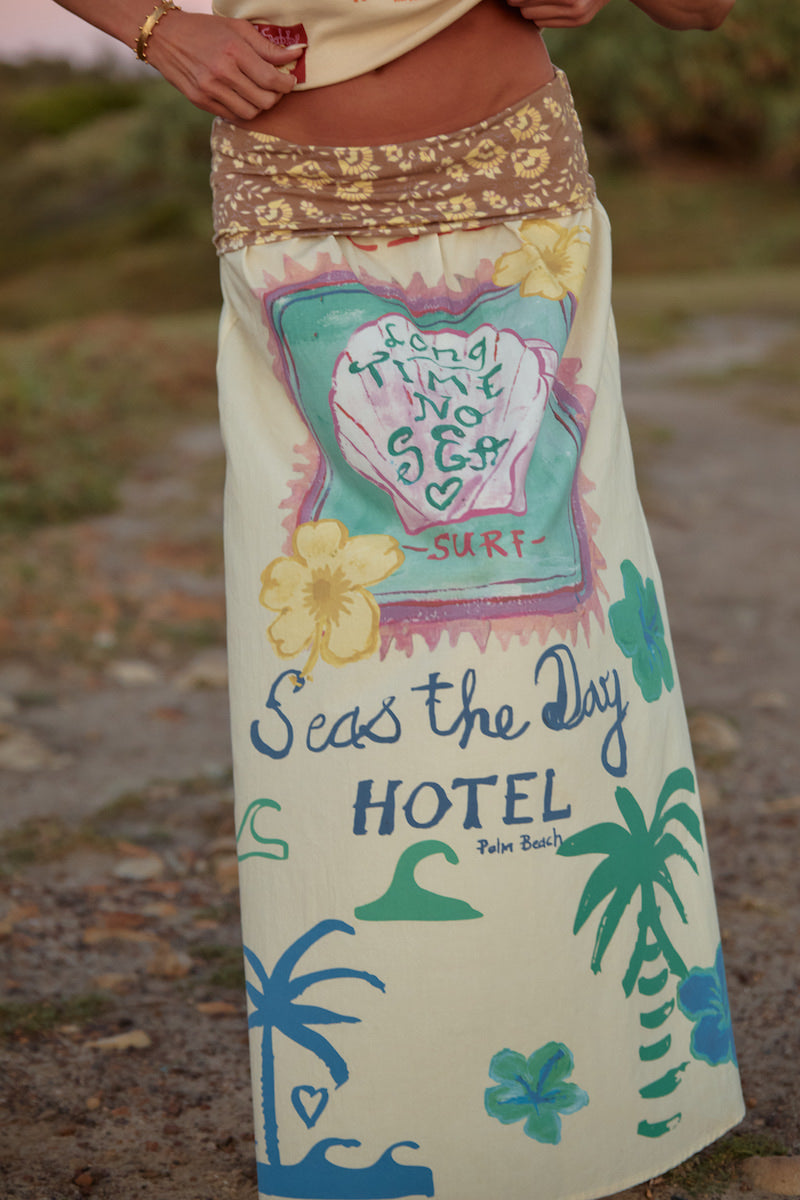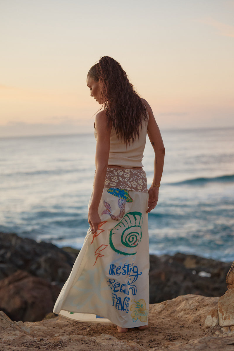 Designed with a soft, fold-over waistband and a relaxed maxi length, this skirt features bold, hand-drawn Seas The Day artwork with mermaid, shell and floral details throughout. 🐚🌺