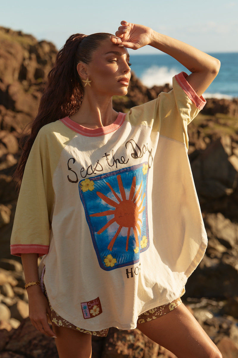 The Seas The Day Raglan Tee is your throw-on-and-go coastal crush, bringing vintage surf energy with a cheeky Sabbi twist. Relaxed, effortless and just the right amount of retro, this tee was made for beach days that accidentally turn into nights.