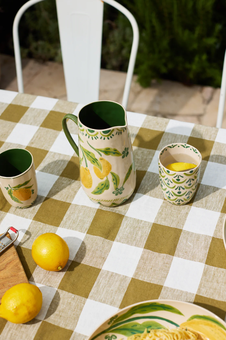 Sun-drenched lemons dance across this generous pitcher, their vibrant hues hand-painted against creamy earthenware. Designed with gatherings in mind, the emerald interior creates a striking contrast as you pour limoncello or wine for friends around outdoor tables. Lovely used in company with the Tavola cups, even by the bedside as a water jug.